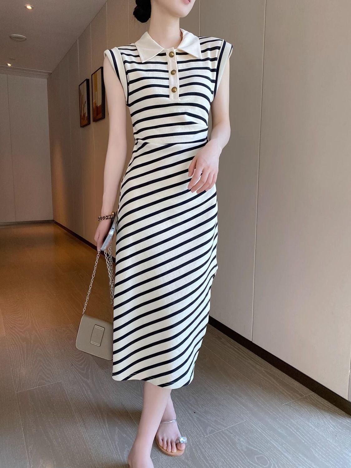 大人可愛い ボーダー柄 ポロネック ロングワンピース m-300