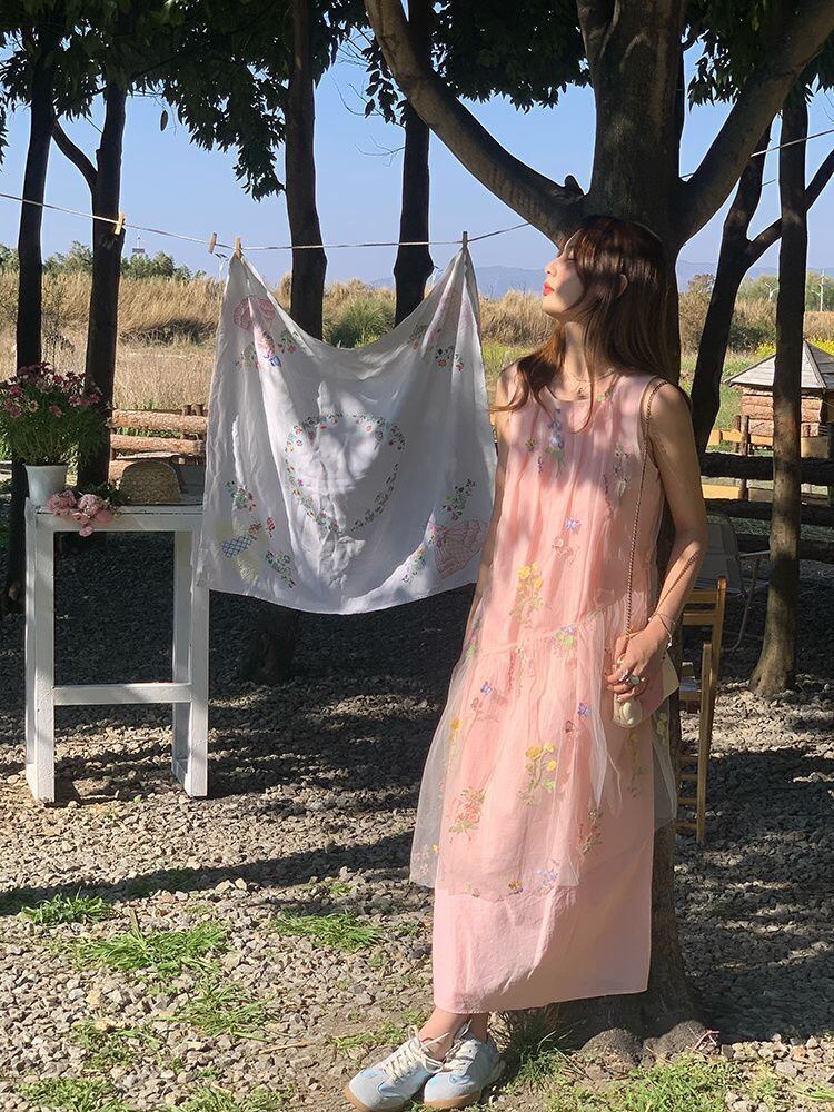 話題沸騰中上質 刺繍 ノースリーブメッシュワンピース m-417