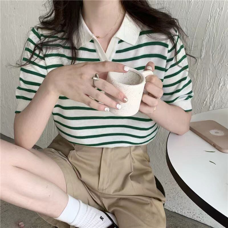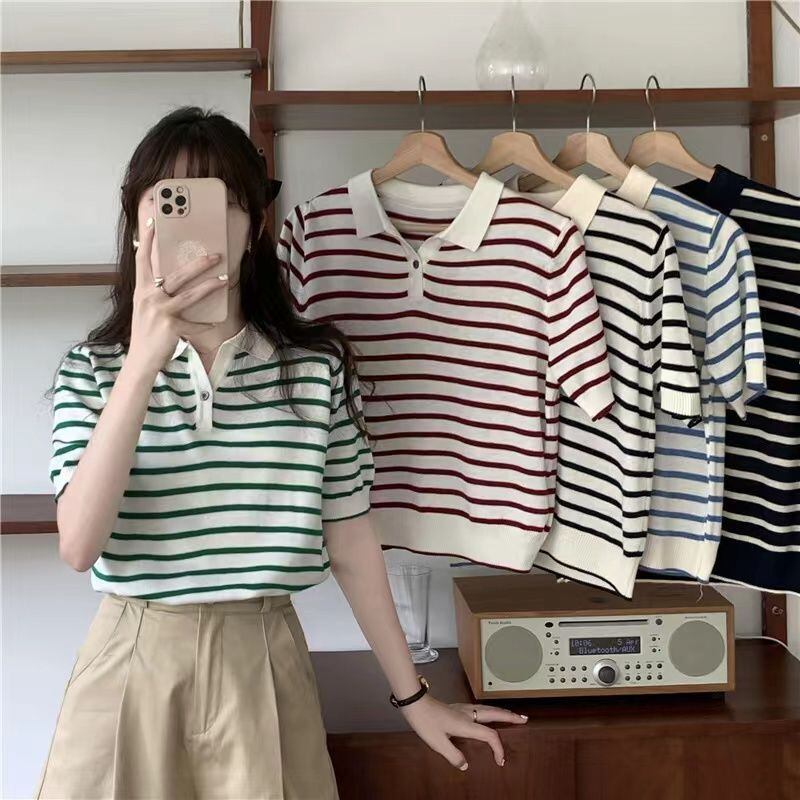 着回し力抜群 ボーダー柄4色展開 ポロネック半袖 Tシャツ m-575