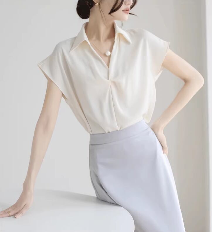 気質満点 OL、通勤 フレンチスリーブ Vネック シャツ m-632