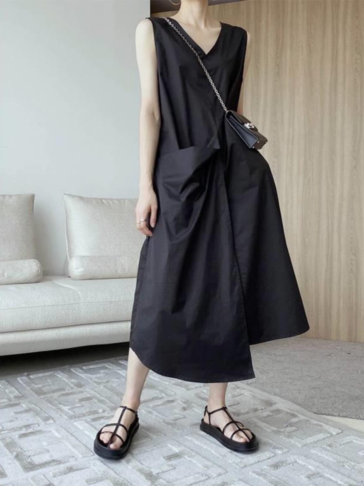目立つ 2way Vネック ポケット ノースリーブ ワンピース m-697